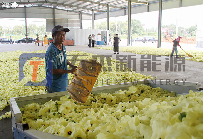 黃蜀葵采摘后,前期挑選處理完裝入黃蜀葵烘干設(shè)備的烘干托盤(pán)里,開(kāi)放的不同程度的黃蜀葵建議分開(kāi)放置,為保證原有顏色,花苞與花朵建議分批次烘干。然后將物料盤(pán)放進(jìn)物料車(chē),一般14P的黃蜀葵烘干機(jī)可以放入物料車(chē)8臺(tái),每臺(tái)裝150斤鮮物料。
