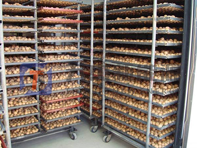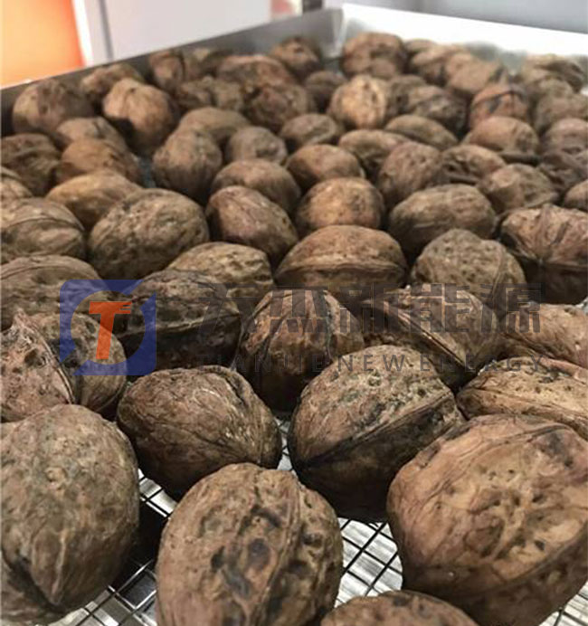 脫青皮后,8小時內(nèi)使用核桃烘干機(jī)排濕烘干,排濕溫度 30-35 ℃,核桃烘干機(jī)設(shè)備烘烤時間 12-15小時,果殼表面水分散失,顏色由黑褐轉(zhuǎn)為褐色時排濕結(jié)束.