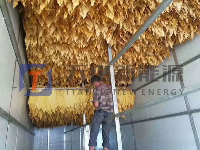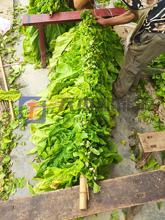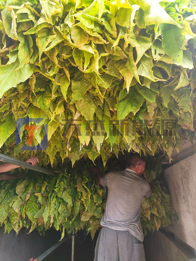 前期煙葉編裝的時(shí)候要使煙葉間距平均,有利于熱風(fēng)進(jìn)行循環(huán),這樣煙葉各部分才能受熱均勻,在綁桿的時(shí)候需要遵循一個(gè)原則,成熟稍差的煙葉放在溫度低的地方,成熟的煙葉放在中間層,過(guò)熟的煙葉放在溫度高的地方,當(dāng)天采收的煙葉當(dāng)天進(jìn)入煙草烘干烤房。煙葉烘干的前期為變色期,使煙葉變軟,溫度需要控制在38度以內(nèi),濕度控制在90%以上