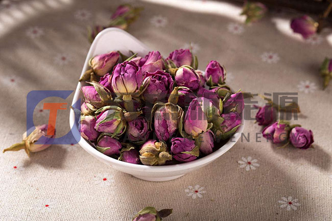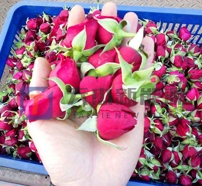 干花蕾出爐:烘干車進入玫瑰花烘干房大約8小時,只要色澤鮮艷,具有玫瑰特有的香氣,花蕾呈飽滿錘形,顏色為紫紅色或醬紫紅色,花托、花萼為黃綠色,用手捻花蕾呈粉片狀,花托70-80%的用手捻碎后呈粉絲狀時,表示已干透,此時裝滿干花蕾的烘干車就可以推出玫瑰花烘干房。