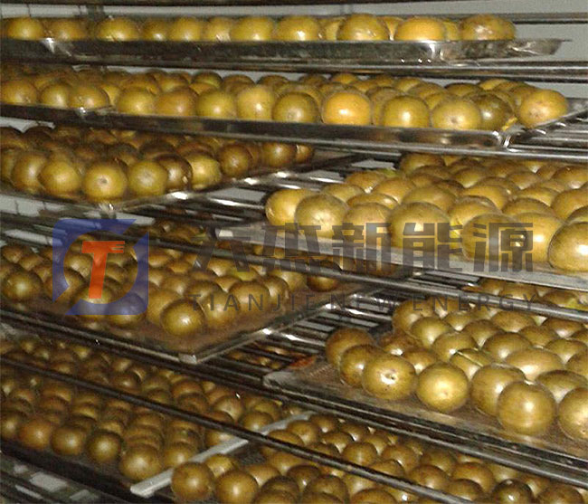 烘干③階段:降溫到55-60度之間,繼續(xù)烘干2天,使果實(shí)的重量下降到相當(dāng)鮮果的25-30%即可成為干果。采取關(guān)閉空氣能烘干排濕熱泵系統(tǒng),讓其自然降溫,待冷卻后才能出爐。