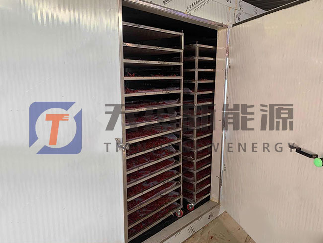 黑龍江五味子烘干機客戶現(xiàn)場成品預(yù)覽:將準(zhǔn)備烘干的五味子平鋪在烘盤中推入五味子烘干機