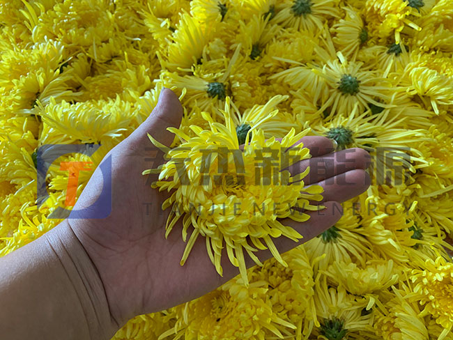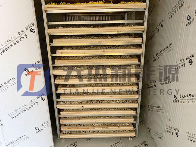 將挑選好的金絲皇菊均勻的鋪在烘盤中推入信陽金絲皇菊烘干機內(nèi)準備烘干